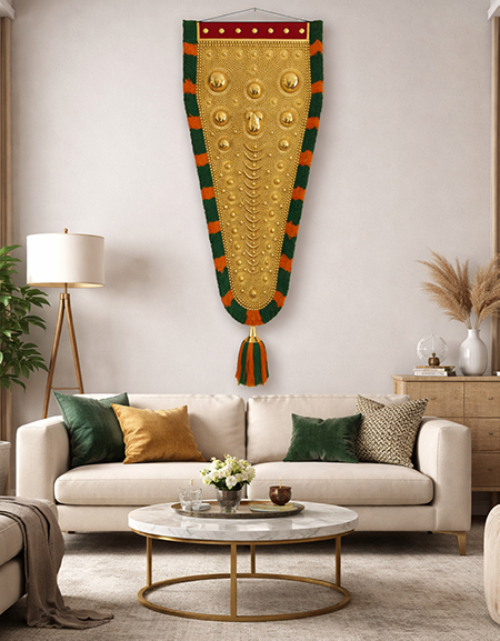 Elevate your home decor with our exquisite Nettipattam, handcrafted to reflect Kerala’s rich cultural heritage. Featuring vibrant colors and a circular design symbolizing prosperity, this piece invites positive energy into your space. Hang it in an east-west direction for a meaningful and beautiful addition to your home.